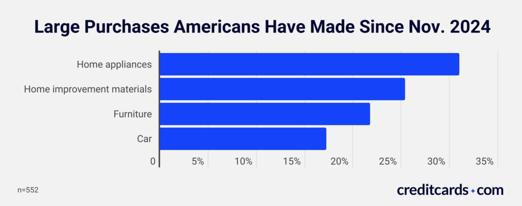 Since November 2024, 28% of Americans have made large purchases over $500, with electronics (39%), home appliances (31%), and home improvement materials (25%) topping the list. Among them, 55% took advantage of holiday deals.