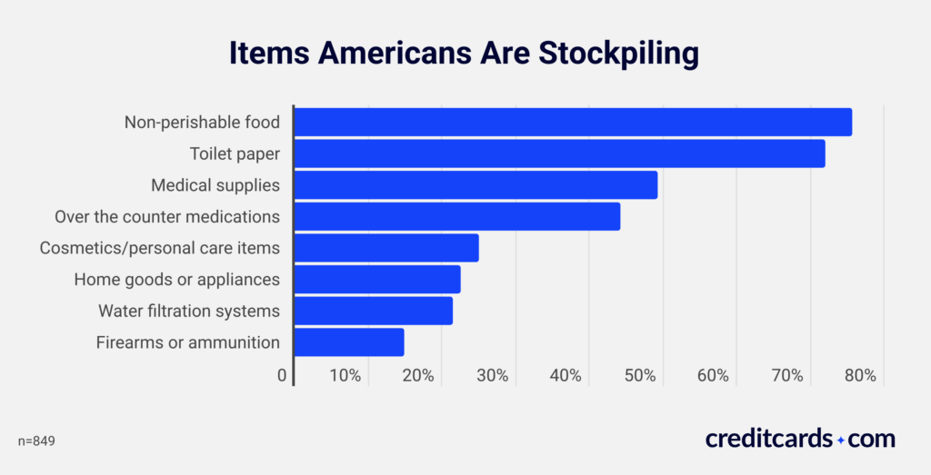 More than 4 in 10 Americans (42%) have either already started stockpiling or plan to, with non-perishable food (76%) and toilet paper (72%) being the most commonly hoarded items. Medical supplies (49%) and over-the-counter medications (44%) were also high on the list.