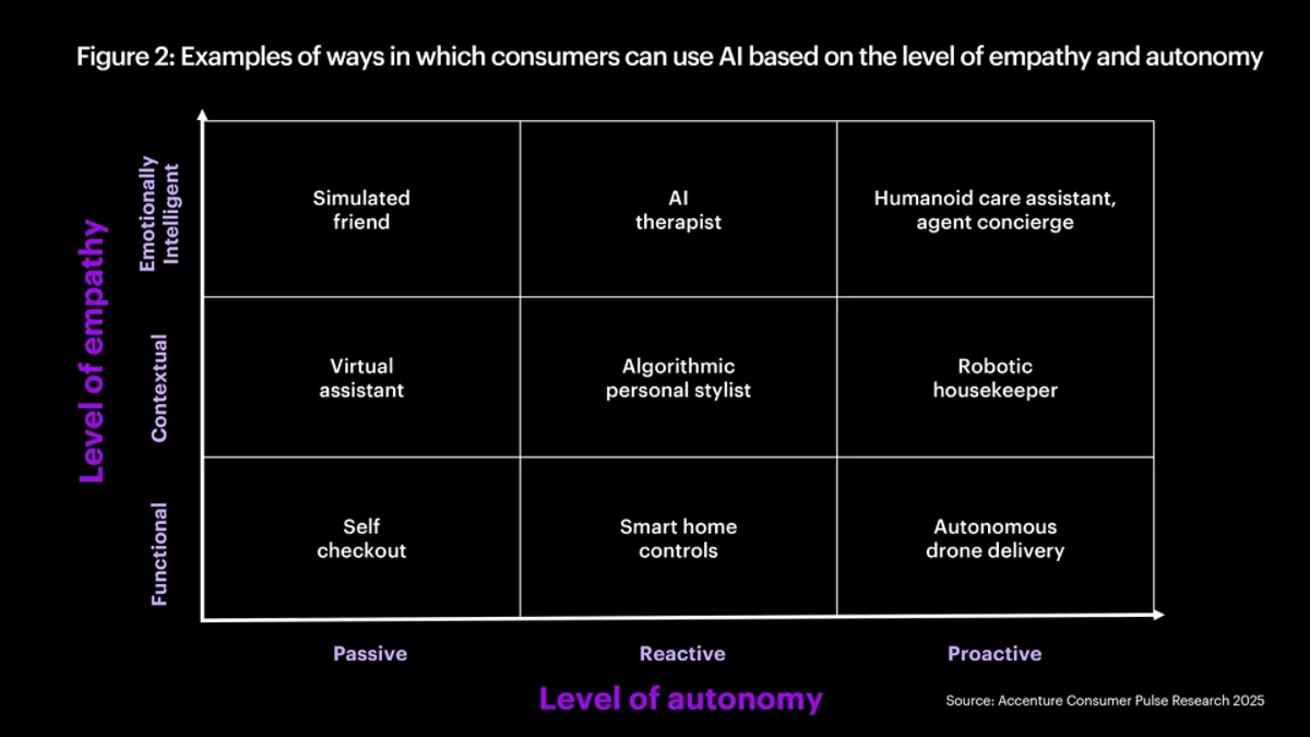 “For some time, our view has been that AI will become the most important guide for consumers to decide what and where they buy.  Our findings confirm that this is happening faster than we expected because of the emotional bonds that humans are forming with AI,” said Oliver Wright, Accenture’s global lead for Consumer Industries.