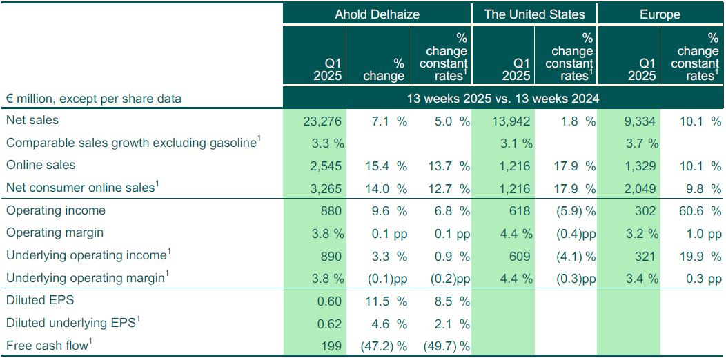 The U.S. segment of Ahold Delhaize, which includes grocery brands such as Food Lion, Hannaford, Stop & Shop, and Giant Food, recorded net sales of €13.9 billion in Q1. This marks a 1.8% increase at constant exchange rates and a 5.2% rise at actual rates. Comparable sales excluding gasoline climbed by 3.1%, with much of the growth driven by digital expansion and targeted price reductions to reinforce customer loyalty amid an uncertain economic climate.