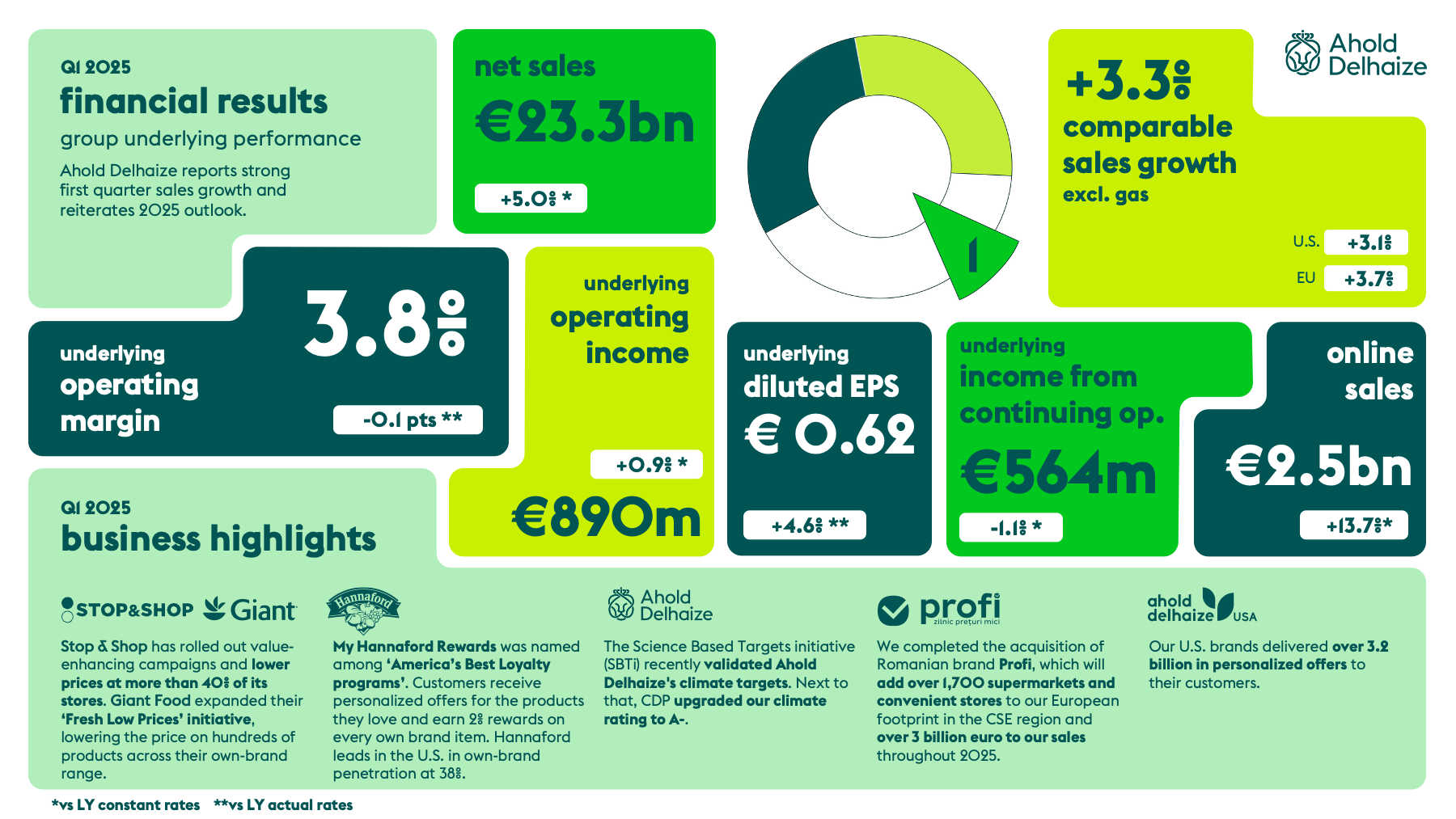 "I am pleased to report strong first quarter sales growth, placing us well on track to reach our goals and strategic ambitions for 2025. It has been a dynamic start to the year for customers in both regions, with increasing macroeconomic and geopolitical volatility. In the U.S., there have been spikes in the price of eggs and evolving conditions around tariffs. In Europe, we have experienced ongoing conflict and tension in Ukraine and large-scale anti-corruption protests in Central and Southeastern Europe (CSE),” said Frans Muller, President and CEO of Ahold Delhaize.