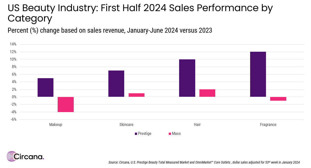 CHICAGO – The U.S. prestige beauty market grew by 8% to $15.3 billion in the first half of 2024 while sales at mass merchants were flat, according to Circana.