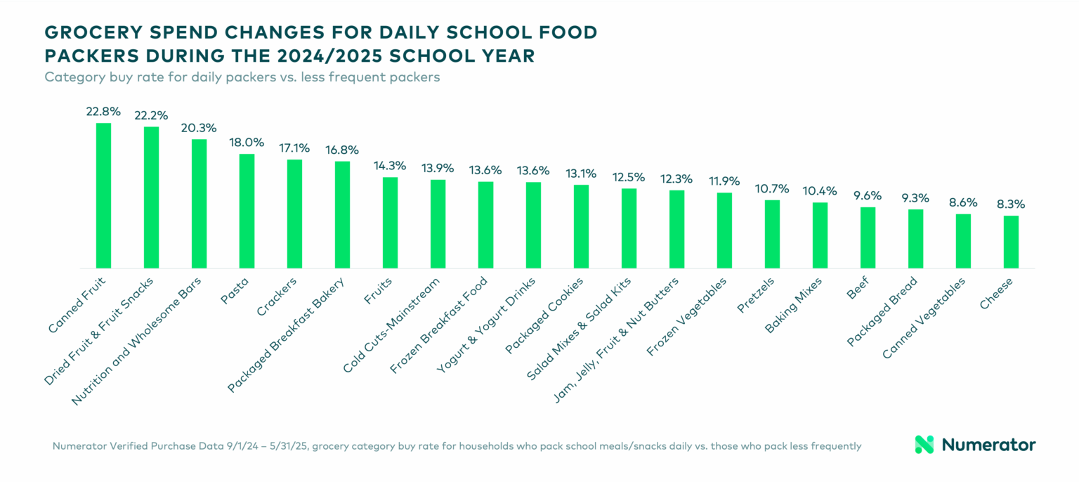 Families who consistently packed meals spent nearly 5% more on groceries during the 2024/2025 school year than those who packed less often. The biggest increases were seen in snack and produce categories, as well as staples such as cold cuts, nut butters, bread, and cheese.