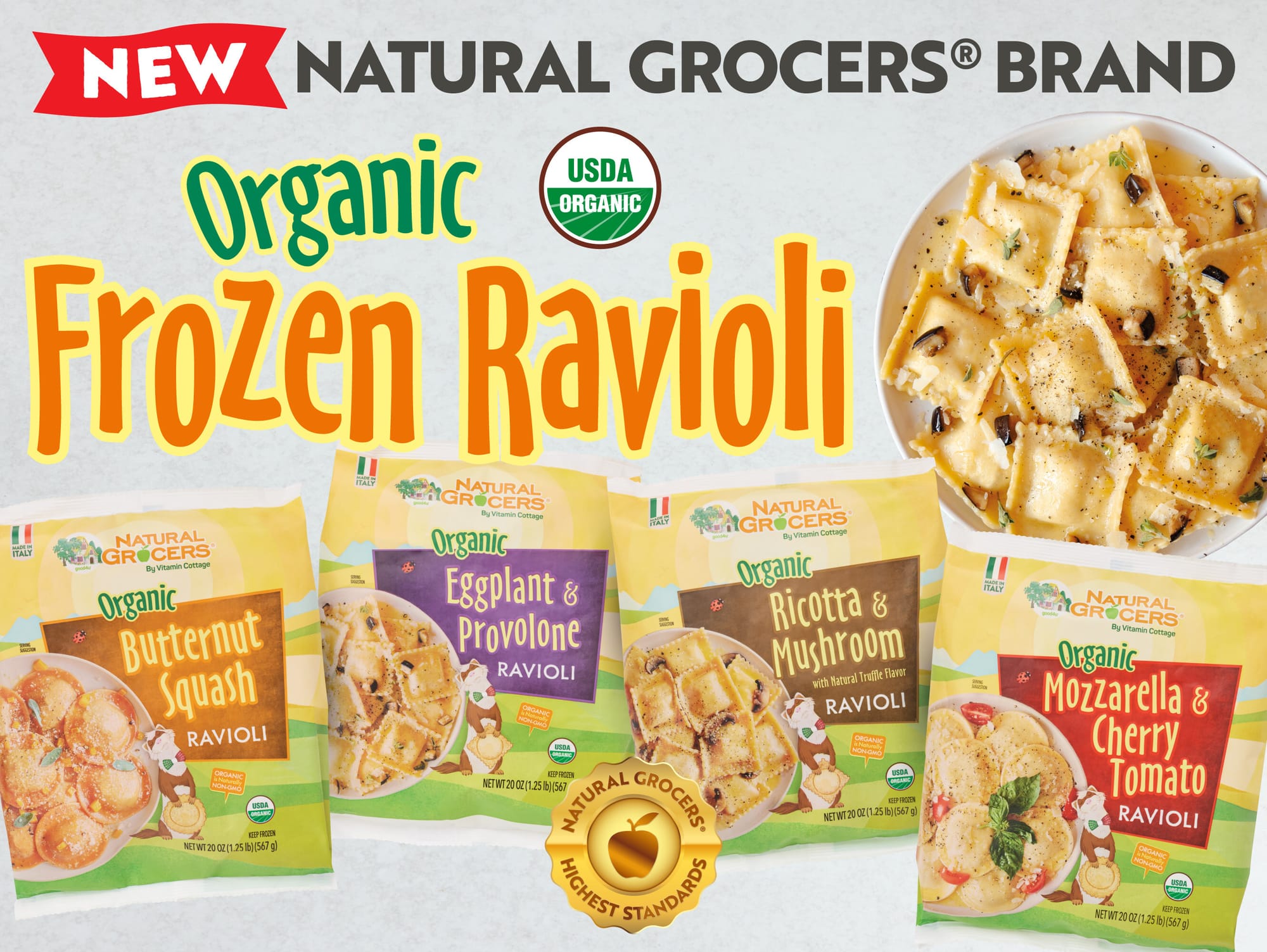The new Natural Grocers Brand Organic Frozen Ravioli lineup includes four flavorful varieties, each packaged in a generous 20-ounce bag and available exclusively at Natural Grocers stores: