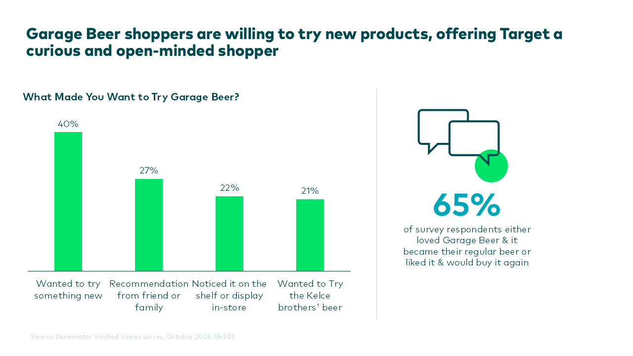 Numerator data also shows that Garage Beer’s shoppers tend to be younger, have higher incomes, and are already active Target shoppers. Additionally, the Numerator Verified Voices survey indicates they are motivated by discovery and report high satisfaction with the brand. With limited overlap between Garage Beer buyers and the existing Target beer selection, the brand can argue that it would attract new households to the category rather than cannibalize current sales.