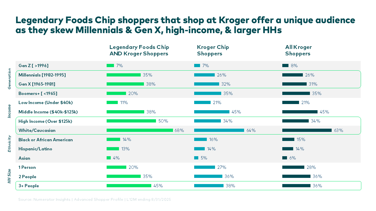 For brands aiming to grow their presence within an existing retailer, Numerator highlighted Legendary Foods at Kroger. Over half of Legendary Foods shoppers already visit Kroger, yet only 8 percent purchase the brand there. In the past year, Kroger shoppers spent nearly $94 million on Legendary Foods, but only $4.5 million in Kroger stores. Closing even one percentage point of that gap could generate roughly $300,000 in additional sales for Kroger.