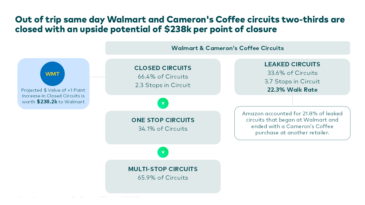 Walmart already wins about two-thirds of shopping circuits that include a Cameron’s purchase, but analysis shows that gaining just one more point in those circuits would be worth $238,000. Circuit and trip data also reveal that 22 percent of these circuits involve shoppers visiting Walmart before ultimately buying Cameron’s elsewhere, highlighting missed conversion opportunities.