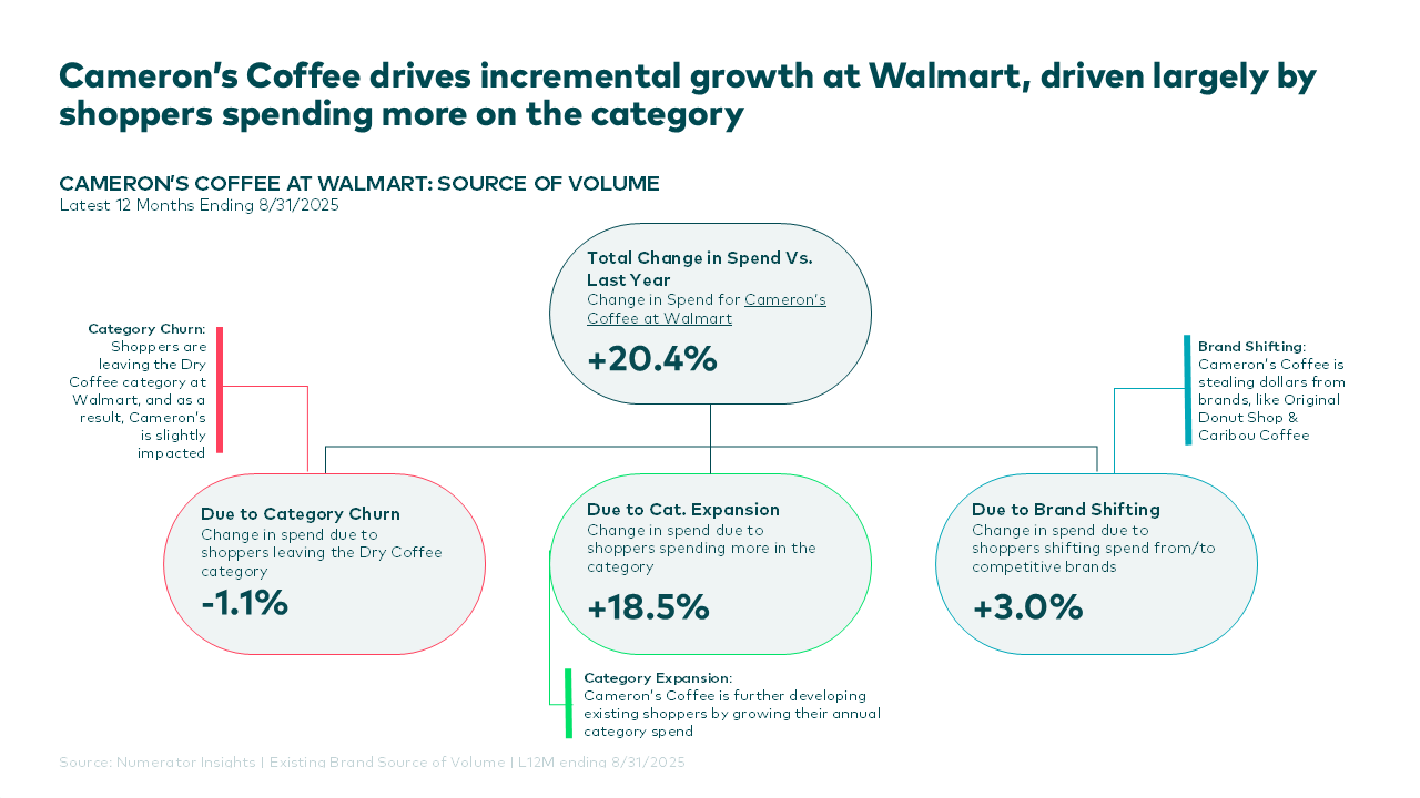 When it comes to protecting existing distribution, Cameron’s Coffee at Walmart shows how behavioral data can demonstrate ongoing value. Cameron’s increased sales by 9 percent at Walmart through higher purchase frequency, more shoppers, and more trips, while Walmart’s overall dry coffee category also grew, indicating that the brand helped expand the aisle rather than just shift share.