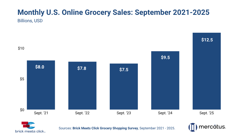 BARRINGTON, Ill. — U.S. online grocery sales reached a record $12.5 billion in September 2025, a 31% increase year over year, according to the latest Brick Meets Click Grocery Shopper Survey, sponsored by Mercatus. This is the second consecutive month of record highs and highlights how strongly consumers are adopting digital grocery channels.