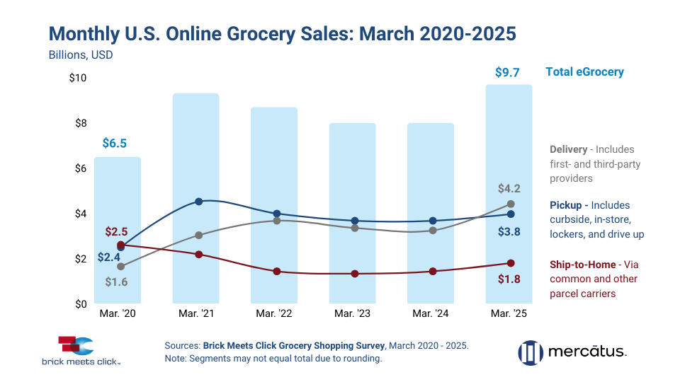 BARRINGTON, Ill. – Five years after the COVID-19 pandemic redefined how Americans shop for groceries, online grocery sales continue to surge, with March 2025 seeing a 21% year-over-year increase, reaching $9.7 billion, according to the latest Brick Meets Click Grocery Shopper Survey, sponsored by Mercatus.