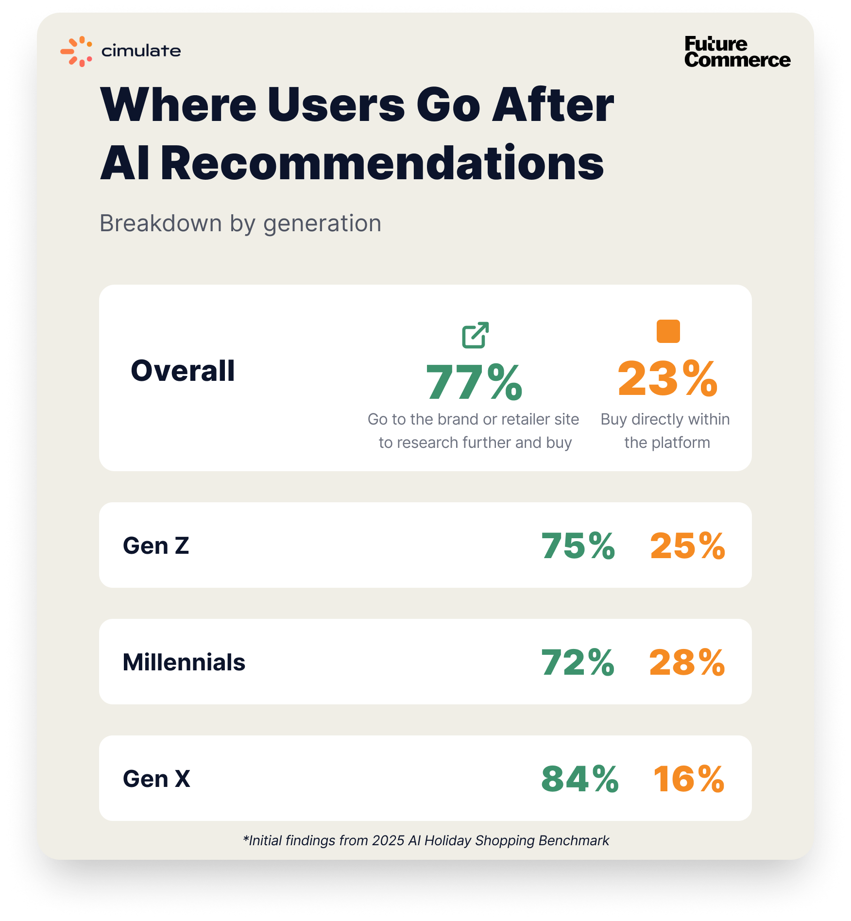 · AI platforms don’t steal traffic; they send it. One standout data point is that when a Gen AI platform makes a recommendation, 77% of consumers are more likely to go to the brand or retailer site for further research and purchase, compared to the 23% who are willing to check out via the Gen AI platform. This means there's still a strong preference for validating information and buying from trusted brands and retailers. However, after doing some research, these shoppers are extremely high-intent, so brands and retailers need to be on their digital game to convert them.