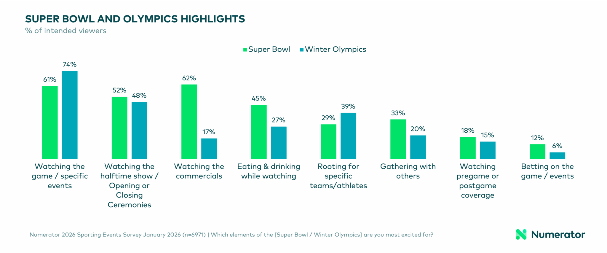 Where the events differ sharply is in how and where people watch. The Super Bowl remains a communal ritual, with more than half of viewers watching with others outside their household or hosting guests at home. Olympic viewing tends to be quieter and more flexible: over three-quarters of Olympic viewers plan to watch alone or with household members, reflecting the multi-day, multi-event format.