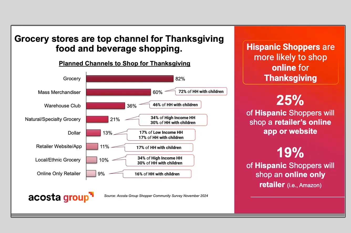 The shift toward digital convenience is evident, particularly among Hispanic shoppers. According to the study, 25% of Hispanic respondents will shop for Thanksgiving using retailer apps or websites, and 19% plan to use online-only retailers such as Amazon. This aligns with findings from the Acosta Group's November Hispanic Shopper Survey, which highlighted higher online shopping engagement among Hispanic consumers compared to non-Hispanics.