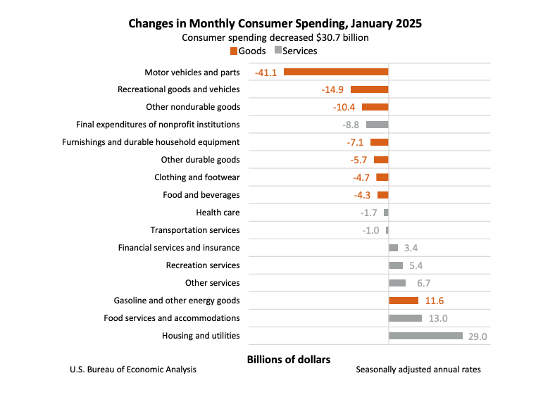 - Goods spending plummets: Spending on goods fell sharply, led by a $41.1 billion drop in motor vehicles and parts. Other categories, such as recreational goods, furnishings, and clothing, also saw declines, reflecting reduced demand for physical goods.