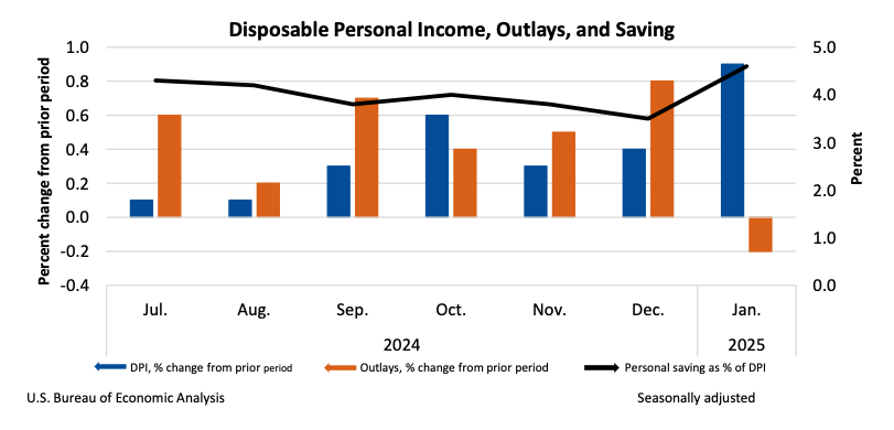 - Income growth: Despite the spending pullback, personal incomes jumped by 0.9% in January, partly fueled by a large annual cost-of-living adjustment for Social Security beneficiaries. Disposable personal income (DPI) also rose by 0.9%, giving Americans more financial flexibility.