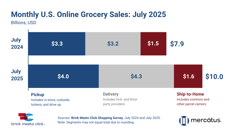 BARRINGTON, Ill. — U.S. online grocery sales hit $10.0 billion in July 2025, a 26% jump from the previous year, driven by record-breaking household penetration, strong order activity and higher spending, according to the latest Brick Meets Click Grocery Shopper Survey sponsored by Mercatus.