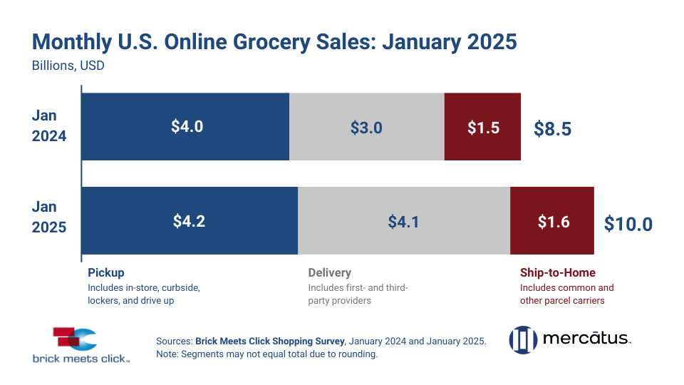 Barrington, Ill. – U.S. online grocery sales started 2025 on a strong note, reaching $10.0 billion in January—a 16.6% year-over-year (YOY) increase, according to the Brick Meets Click Grocery Shopper Survey, sponsored by Mercatus. This marks the sixth consecutive month of sales exceeding $9.5 billion, driven by all three primary fulfillment methods, with delivery leading the charge.
