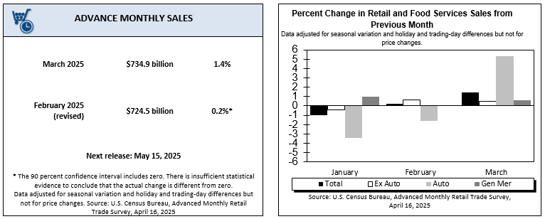 WASHINGTON – U.S. retailers saw a welcome boost in March as retail and food services sales climbed 1.4% over February to a seasonally adjusted $734.9 billion, according to new advance estimates released by the U.S. Census Bureau. The gain marks the strongest monthly rise in 2025 and reflects resilient consumer demand across key categories.
