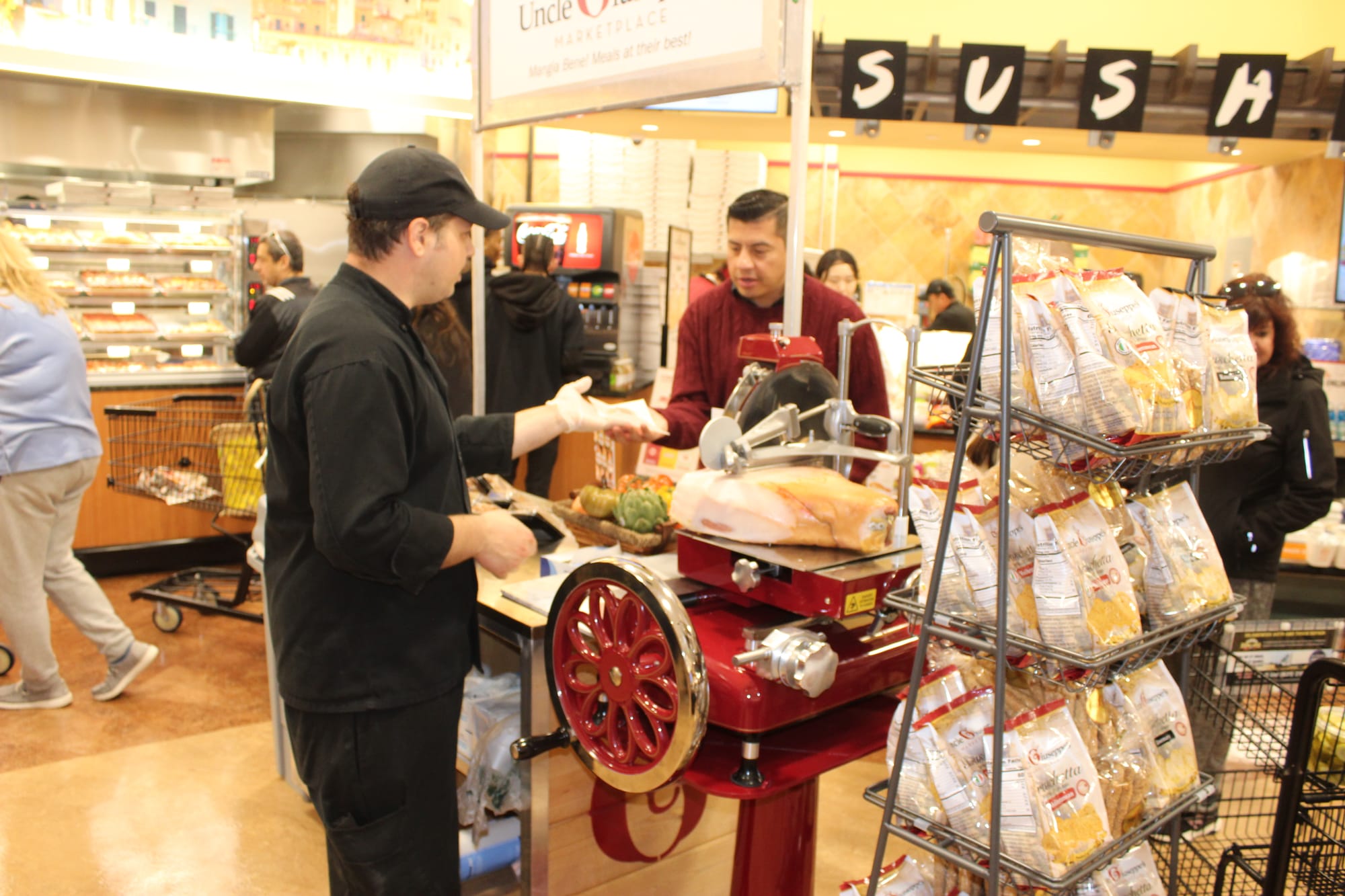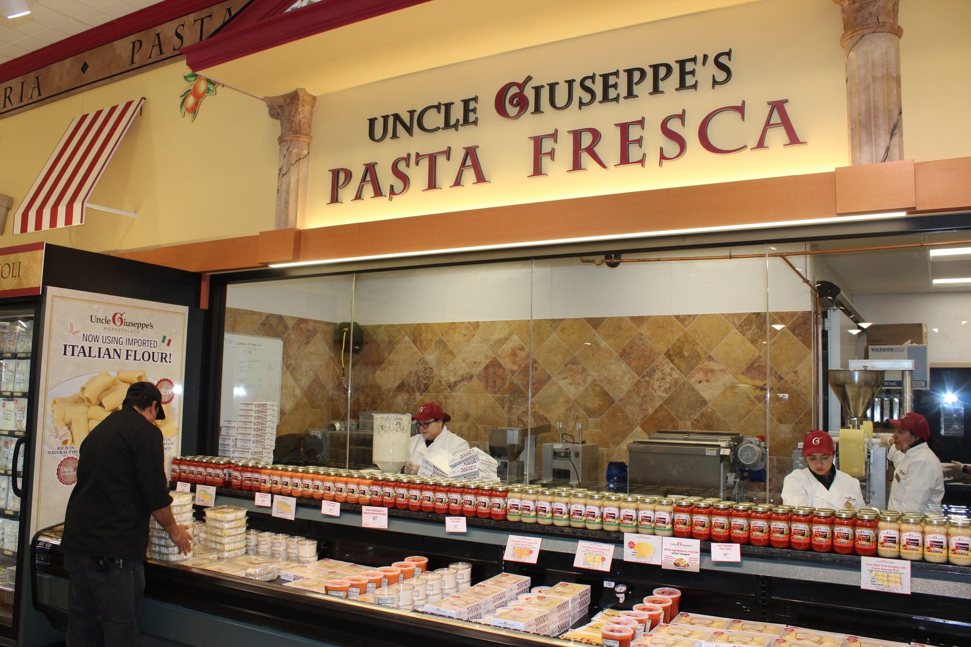 Upon entering the store, shoppers are greeted with towering displays, Italian décor and signage, and the inviting scent of sauce simmering in a pot.