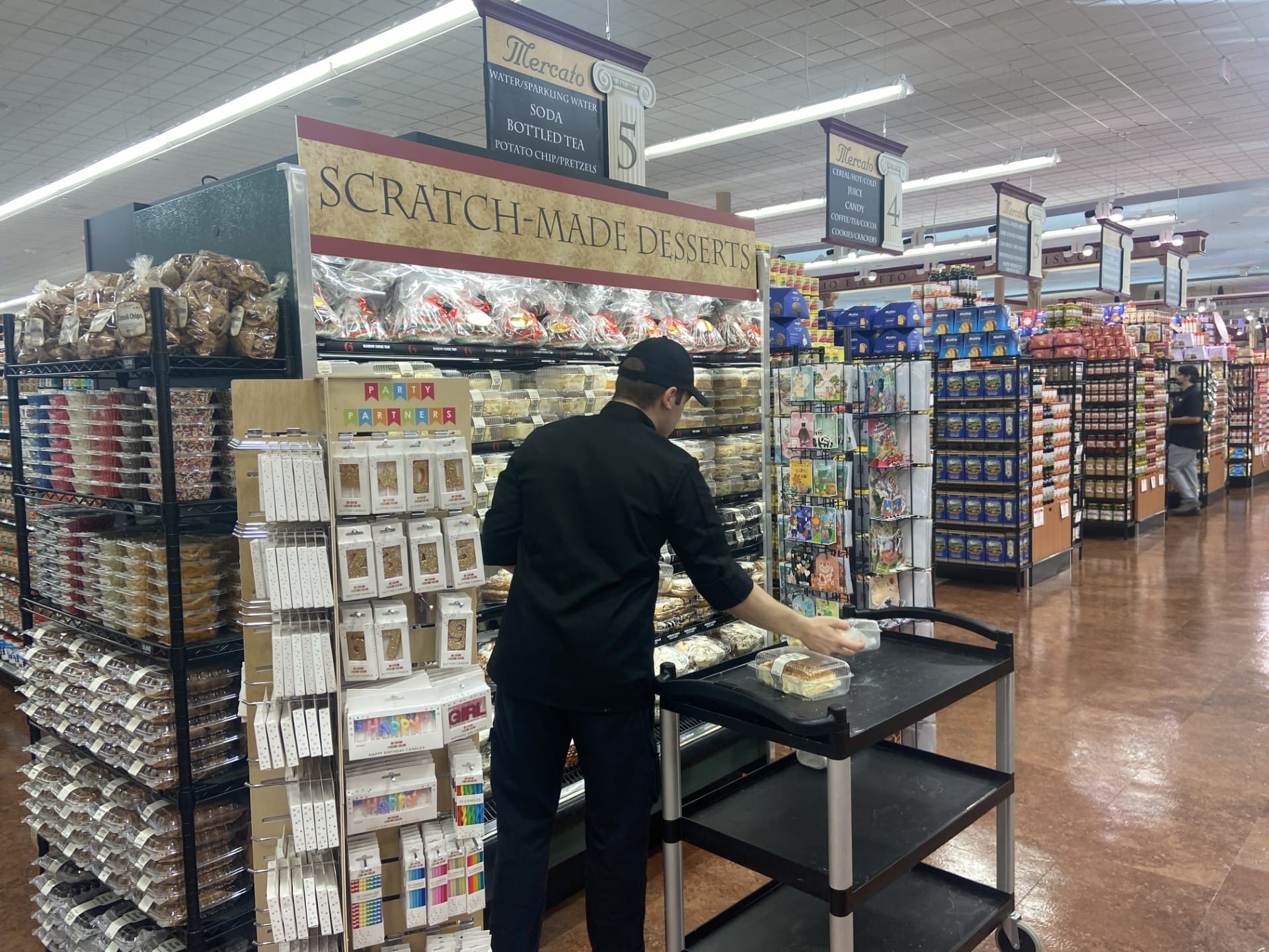 The grocer is also known for playing a mix of classic and contemporary Italian melodies from such singers as Frank Sinatra and Dean Martin. Many of the stores feature live music. Behind glass counters, fresh pasta and creamy mozzarella are created while customers look on and employees offer generous samples with the warmth and enthusiasm of a Sunday family dinner. A bell is rung in the bakery every 30 minutes when fresh bread comes out of the oven.