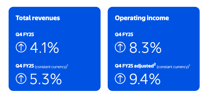 BENTONVILLE, Ark. — Walmart has released its fourth-quarter earnings results, showing strong revenue and operating income growth. Revenue and adjusted earnings per share exceeded Wall Street's expectations in the retailer's fourth quarter and fiscal 2025 results. Quarterly revenue rose 5.3% to $182.6 billion, while adjusted EPS increased 10% to $0.66 compared to a year earlier.