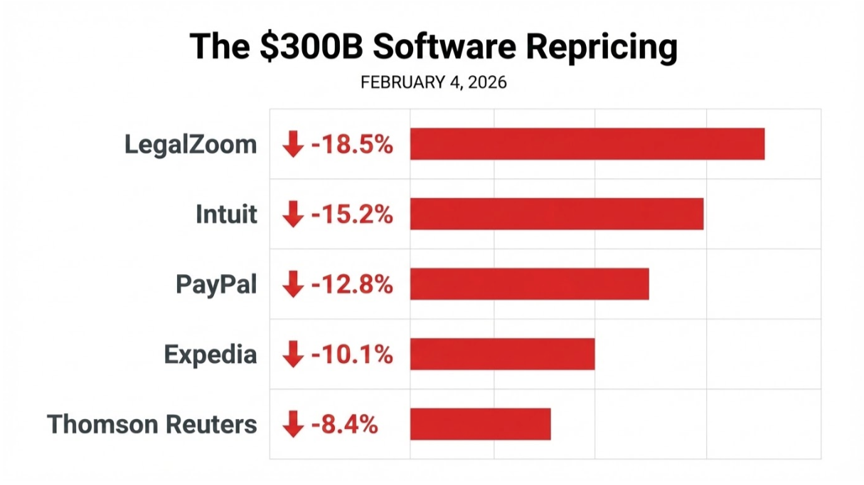 The selloff swept across legal, tax, payments, travel, and research software—different industries, same vulnerability: interaction logic and workflow automation.