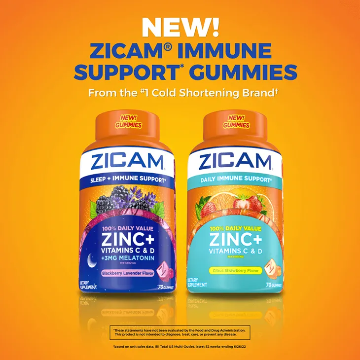 “For over 20 years, Zicam has led the way in helping consumers shorten their colds, and we’re constantly looking at new and innovative ways to aid consumers who care about their immune health,” said Michael Vercelletto, marketing director of Zicam. “Our expansion into the immune support space, with Zicam Daily Immune Support and Zicam Sleep + Immune Support with Melatonin, is focused on giving consumers the boost of support that they can rely on in an easy to take delicious gummy supplement — day and night.”